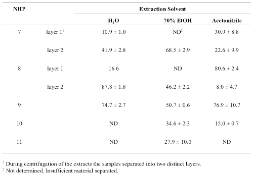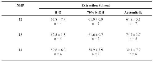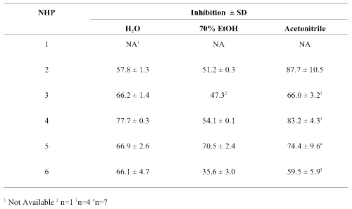 Multiple layers were obtained after centrifugation of the soft gel product extracts. Two distinct liquid layers were obtained with water and acetonitrile. The second layer was very small and insufficiently separated when samples were extracted with ethanol. In the soft gel products, the inhibitory effect varied extensively between products and extraction solvent. Layer 1 of the acetonitrile extracts of NHP 8 gave the highest inhibition, whereas the highest inhibition in the aqueous extract of NHP 8 was found in Layer 2. In each instance, these levels were nearly 2-fold greater than those obtained with NHP 7. The highest levels of inhibition were obtained with the NHP 7 ethanolic extract. The caplet (NHP 9) had moderate activity. Low activity (<35% inhibition) was detected in the tablet (NHP 10) and tincture (NHP 11) products with the highest levels of inhibition in the ethanolic extracts.