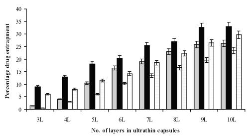 Entrapment efficiency of stored LBL capsular formulations was determined after 10, 20, 30 days and percent residual drug content was calculated. Entrapment efficiency was determined by the method described earlier. Unentrapped drug was first separated by use of the centrifugation method at 2500 rpm. Then supernatant was measured for drug and remaining amount entrapped in the capsular formulation was determined in Shimadzu UV-1601 spectrophotometer. Initial drug content were taken as 100% for each of the formulations.