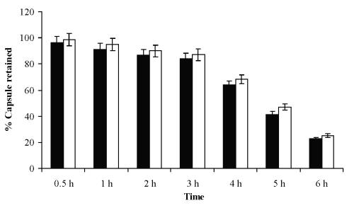 % Capsules retained = (Initial number of capsules incubated - number of capsules drained off)/Initial number of capsules incubated X 100 (3)