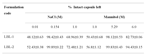 Effect of osmotic strength on capsules .The sodium alginate/PAH capsules are very sensitive to the environmental condition, e.g., temperature, salts (electrolytes and non-electrolytes) and even protein. For the optimal stability of the ultrathin capsules, 0.154 M NaCl and 5.29 M mannitol solution is necessary because these are isotonic to physiologic body fluid. As the osmotic pressure is lowered greater swelling is induced by the osmotic pressure of the sodium counter ions in the capsule interior, which causes burst effect and increase in ionic concentration causes complete shrinking of the hollow capsules, thus ultimately effecting the percent intact capsules (Table 2) suggesting its behaviour as flexible, permeable biological membrane like structure (like biological membrane).