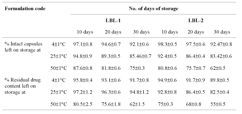 The hollow capsular formulations were stored at 4±1°C, 25±1°C (room temperature) and 50±5°C and the residual drug content measured after 10, 20 and 30 days. The residual drug content of formulation stored at 50±5°C were found to be lowest due to least stability of capsules by polymer solvation at higher temperature than at 25±1°C (room temperature) and highest residual drug content was found in formulations stored at 4±1°C, which indicated that the formulations tend to degrade faster at higher temperature (Table 3).