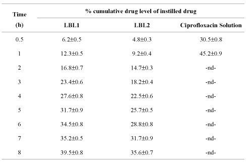 Table 4: Tear level of ciprofloxacin from various formulations (n=3).
