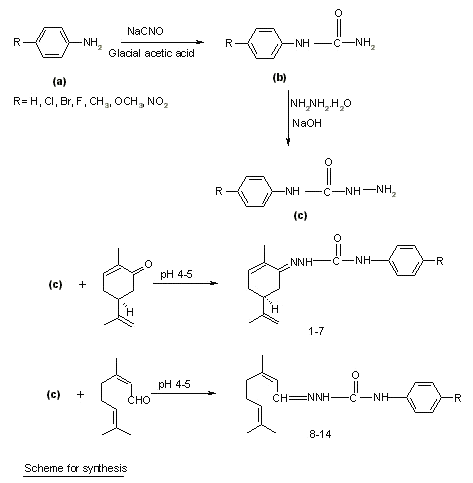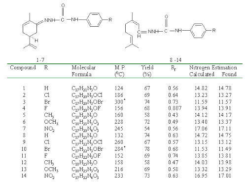 Synthesis of substituted semicarbazones : Different para substituted aryl semicarbazides were prepared by method previously described by Pandeya et al. [10]. Equimolar quantities of terpene (0.005 mol) and the appropriate substituted phenyl semicarbazide (0.005 mol) were dissolved in 20 ml of ethanol (95%) and pH of the reaction mixture was adjusted between 4-5 by adding glacial acetic acid. The mixture was refluxed for 45 min to 1.5 h and then cooled in an ice bath. In some cases, the solution was poured on crushed ice to induce crystallization. The resultant precipitates were filtered, dried and recrystallized from aqueous ethanol (95%). Physical data of synthesized compounds are given in Table 1.