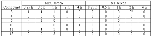 Compounds 3, 4, 5, 10, 11 and 12 were evaluated for activity and neurotoxicity after oral administration in rats. For these compounds were administered in a dose of 30 mg/kg and effects observed at 0.25, 0.5, 1, 2, and 4 h intervals. All the compounds evaluated showed some protection. Compound 3 showed marginal protection at three time points. Compound 10 showed delayed activity at 4 h. None of the compounds showed neurotoxicity in this test. Only compound 3 showed hyperesthesia after 2 h.