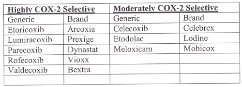 Table 1: A selected group of non-steroidal anti-inflammatory drugs with various degree of selectivity in inhibiting the cyclooxygenase 2 pathway.