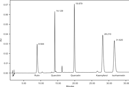 Figure 2 shows a typical HPLC-UV (350nm) chromatogram of five flavonols, rutin, quercitrin, quercetin, kaempferol and isorhamnetin with retention times 8.7, 14.1, 19.8, 28.1 and 31.5 minutes respectively.