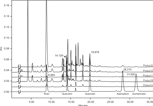 HPLC analysis of 5 Ginkgo biloba preparations gave remarkably similar fingerprint profiles (Figure 3) indicating higher amounts of rutin compared to the other flavonols.