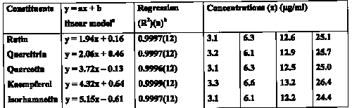 The peaks were monitored in the UV range from 200-400nm. Quantitation was performed at 350nm for rutin, quercitrin and quercetin and 365nm for isorhamnetin and kaempferol, respectively. Assessment of peak purity showed peak homogeneity thereby excluding the possibility of the presence of interfering components and rendering the method specific. Linear ranges and correlation co-efficients are depicted in Table 1.