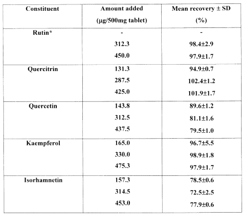 Table 2: Recoveries of flavonols from Ginkgo biloba extract (product A).