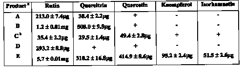 Table 3: Flavonol marker content (per tablet) in 5 dosage forms purchased at a local pharmacy.