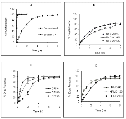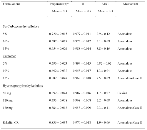 The release was identified as anomalous most likely owing to the relative contributions of drug diffusion, polymer relaxation, and matrix erosion to drug release. HPMC matrices containing smaller amount of HPMC showed an initial burst of drug release rate, due to the time required for the formation of an efficient gel layer (16). As the granulating process was conventional, the solution would not form a continuous layer of the acrylic resin over the drug.