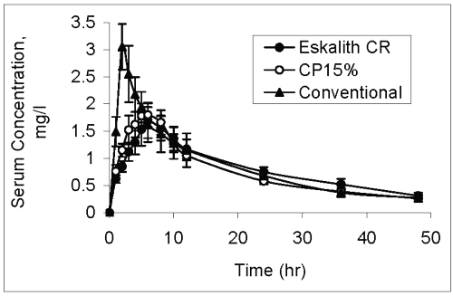 The data generated in the present investigation using sustained-release LC tablets indicated that the absorption of LC from gastrointestinal tract may depend mostly on the release rate. A direct correlation between the dissolution profiles of standard Eskalith CRŽ and CP15% with the relative bioavailability of the formulations could be observed. The sustained release manner of CP 15% may prevent high peak blood levels, wide blood level variations, frequent dosing and gastro-intestinal side effects of LC in man and therefore promotes patient compliance during maintenance therapy. The sustained and controlled release dosage forms of LC have a much slower but continuous absorption as compared to the liquid, tablet, and capsule form. However, the slow-release forms provide equivalent steady-state lithium levels (21).