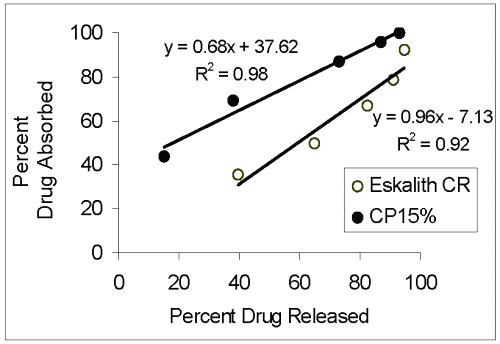 The mean absorption half-lives were found to be 1.60 ± 0.45 hr for standard sustained-release tablets, (Eskalith CRŽ), 1.21 ± 0.29 for CP15%, and 0.82 ± 0.28 hr for conventional preparation. No differences were observed between mean absorption half-lives of Eskalith CRŽ and CP15% (P > 0.05). The pharmacokinetic parameters estimated from serum lithium concentrations profiles indicated that CP15% matrix tablets were sustained and exhibited a smooth and extended absorption phase as observed with commercially available sustained-release Eskalith CRŽ. The initial slow release pattern of the drug observed in vitro in this formulation, will most likely results in a smooth and extended absorption phase of the drug from formulation in vivo. A good correlation between the dissolution profiles and bioavailability was observed. The relationship between percent drug released and percent drug absorbed is illustrated in Fig 4.