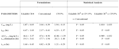 As one would expect from inspection of the mean curves, the sustained release tablets had a significantly delayed tmax, showing 6.67 ± 1.03 for the Eskalith CRŽ, 6.33 ± 1.37 for the CP15% and 2.17 ± 0.41 for the conventional tablets (Table 2). The tmax of the Eskalith CRŽ and CP15% that showed a smooth and extended absorption phase was significantly longer than that obtained for conventional. This may reduce the incidence of side effects that is usually accompanied with lithium therapy. The differences between AUC values for all tested formulations were not significant (Table 2, P > 0.05, 90% CI=0.989-1.032). The p values for AUC and Cmax were in line with that of the CI. This indicates that the extent of absorption was not different among all formulations. The mean value of the slow disposition rate constants obtained after the administration of the various formulations did not differ. This reflected in the elimination half-lives, which is quite long and did not show statistical differences among various formulations tested (Table 2).