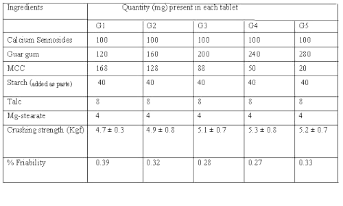 Matrix tablets of calcium sennosides were prepared by wet granulation method. Microcrystalline cellulose (MCC) was used as a diluent and compression promoting agent and a mixture of talc- magnesium stearate (2:1) was added as lubricant. Guar gum was included in the formulations in various proportions (30%-70%). The composition of different formulations used in the study containing 100 mg of calcium sennosides (20%w/w) in each formulation is shown in Table 1.