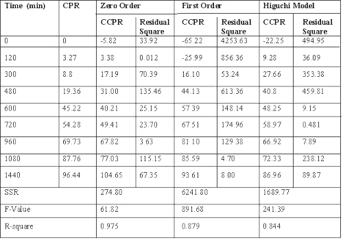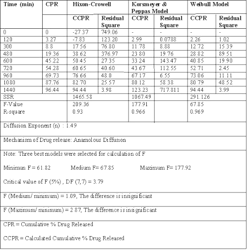 Dissolution data of batch G3, a potential candidate for 24 h drug release, fitted best to zero order release kinetics, giving the least residual sum of square as compared to Weibull model or Korsemeyer and Peppas equation. (Table 2) (20-24).