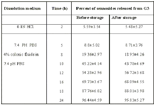 To assess the stability of sennosides matrix tablets, tablets of batch G3 were stored at 45°/75% RH for 3 months. At the end of the study period, the formulation was observed for changes in physical appearance, color, drug content and drug release characteristics. Drug release studies in rat caecal content medium were also carried out on sennosides matrix tablets of batch G3 after storage at 45°/75% RH for 3 months (17).