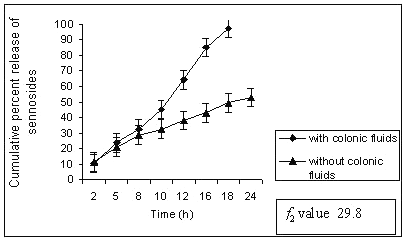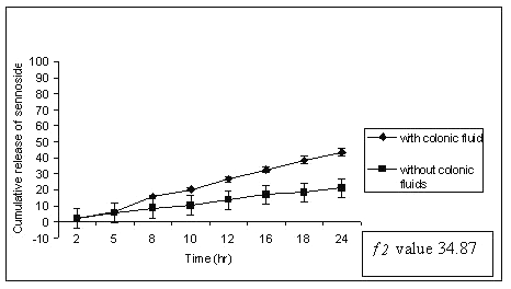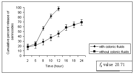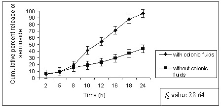 The drug release studies were continued with 500 ml of rat caecal content medium (4%). A continuous supply of CO2 was ensured, as the caecum is naturally anaerobic. At specified time intervals, 10 ml of the sample was withdrawn, filtered and replaced with 10 ml of fresh PBS containing 4% w/v rat ceacal fluids, bubbled with CO2, and the experiment was continued for 24 h as the usual colonic transit time is 20-30 h. Three sample samples for each data point were analyzed for sennoside content using BP method.