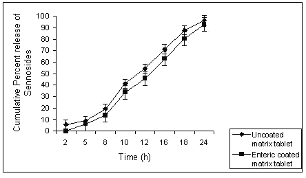 Figure 6: Comparison of percent sennosides released from uncoated and enteric coated matrix tablet of batch G3.