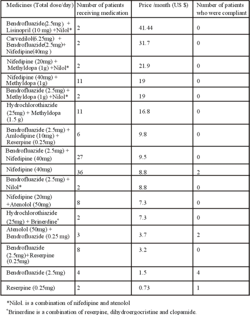 One hundred and nineteen patients (93%) did not comply with their medications. One hundred and fourteen (96%) of the non-compliant patients cited unaffordable drug prices as the reason for non-compliance. Forty-two patients (33%) cited side effects as the reason for non-compliance. 67% of complains about side effects were attributed to nifedipine.