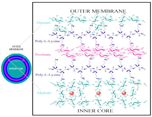 Figure 1: Molecular membrane design for Alginate-Polylysine-Pectinate-Polylysine-Alginate (APPPA) membrane artificial cell microcapsule structure.