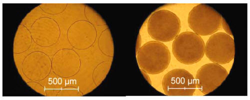 Figure 2: Optical micrographs of APPPA. Left: APPPA microcapsules without bacterial cells, Right: APPPA microcapsules containing with Lactobacillus reuteri (LP80) cells.