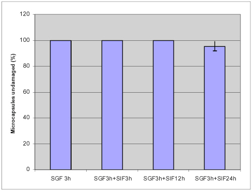 To evaluate the stability of microcapsules for oral therapy, knowledge of encapsulant dynamics is required under relevant physiological conditions that represent the different phases of digestion. In many applications, capsules are subjected to mechanical stresses exerted by their environment that induce deformation and potential break-up; thus capsular mechanical strength is believed to be paramount and should not be compromised. In this study, a shake method was used and the percentage of microcapsules undamaged was observed by microscope to provide information on the mechanical resistance of the microcapsules in various GI conditions. Figures 3 and 4 show that no damage occurs when microcapsules were challenged for 12 hour mechanical shaking at 250 rpm at 37.2°C; neither in simulated gastric fluid (SGF) nor in simulated intestinal fluid (SIF).