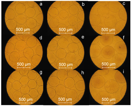 Figure 8: Optical micrographs of APPPA and APA microcapsules. a, APPPA microcapsules; b, APPPA after shaking at 150 rpm, 37.2 ºC in SGF for 3hrs. c, APPPA after shaking at 150 rpm, 37.2 ºC in SGF for 3hrs and in SIF for 12hrs. d, APPPA after shaking at 150 rpm, 37.2 ºC in SGF for 24hrs. e, APPPA after shaking at 150 rpm, 37.2 ºC in storage solution for 72hrs. f, APPPA after shaking at 150 rpm, 37.2 ºC in SGF for 3hrs and in SIF for 24hrs. g, APA microcapsules. h, APA after shaking at 150 rpm, 37.2 ºC in SGF for 24hrs. i, APA after shaking at 150 rpm, 37.2 ºC in SGF for 3hrs and in SIF for 24hrs.