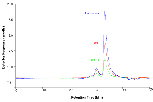 Results show that after shaking for 24hours at 37.2°C and 150rpm, about half the amount of BSA was released from the APA microcapsules as compared to the alginate beads; and about half the amount of BSA was leaked from APPPA as compared to the APA microcapsules, suggesting the superior immuno-protective potential of the APPPA membrane. The APPPA microcapsule membrane would protect live bacterial cells form the host immune system; immune responsible molecules are bigger in molecular weight (e.g. IgM 950 KD, IgE 190 KD, IgA 170 KD, IgD 160 KD, IgG 150 KD) compared to the BSA molecule (mole. wt. 68 KD (11)) tested in this HPLC study and would be impermeable to the APPPA microcapsule membranes. These results suggest the permeability of APPPA microcapsules is lower than alginate core and APA beads giving it a competitive advantage over APA microcapsules.