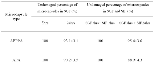 93.2±2.3% of microcapsules was undamaged in simulated gastric solution and 98.9 ± 0.6 % microcapsules remained intact in simulated intestinal solution after shaking up to 24 hours. These results suggested that APPPA microcapsules were stable both in simulated gastric solution and in simulated intestinal fluid.