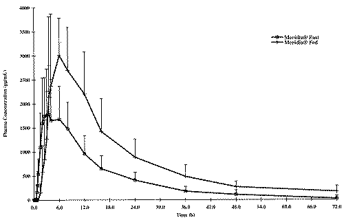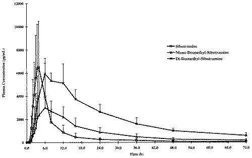 Mean plasma concentration-time curves for the fasted and fed study are illustrated in Figures 1, 2 and 3, respectively for sibutramine and its M1 and M2 metabolites.