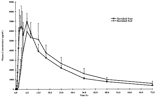 Pharmacokinetic parameters were calculated using non-compartmental methods. Cmax, the maximum observed concentration, and Tmax, the time of observed peak concentration, were determined for each subject and for each treatment. AUC0-t, the area under the plasma concentration-time curve from time zero to the time of the last non-zero concentration was calculated using the linear trapezoidal rule. The AUC0-inf, the area under the concentration-time curve from time zero to infinity (extrapolated) was calculated as AUC0-t, + Ct/Kel, where: Ct = the last non-zero observed concentration. To calculate the elimination rate constant (Kel ), regression analyses were performed on the natural log (Ln) of plasma concentration values (y) versus time (x). The Kel was taken as the slope multiplied by (-1) and the apparent half-life (T1/2 el) as (ln 2)/Kel.