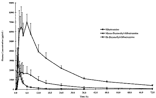Plasma concentrations of sibutramine, M1 and M2 metabolites were measured by LC/MS/MS method according to the following method: Sibutramine and its M1 and M2 metabolites were measured in human heparin plasma using liquid chromatography with tandem mass spectrometry detection. Separation of sibutramine and its metabolites was achieved on a Zorbax C18 column. Plasma samples were spiked with a deuterated internal standard (sibutramine-d7), then extracted with methyl-ter-butyl ether, evaporated under nitrogen and reconstituted in acetonitrile/ammonium acetate. The calibration curves ranged from 50.50 to 25250 pg/mL for sibutramine, from 100.20 to 50100 pg/mL and from 99.00 pg/mL to 49500 pg/mL for M1 and M2, respectively. Inter- and intra-batch coefficients of variation ranged from 1.96 to 11.10% for sibutramine, from 1.85 to 4.08% and from 2.43 to 8.73% for M1 and M2 metabolites, respectively.