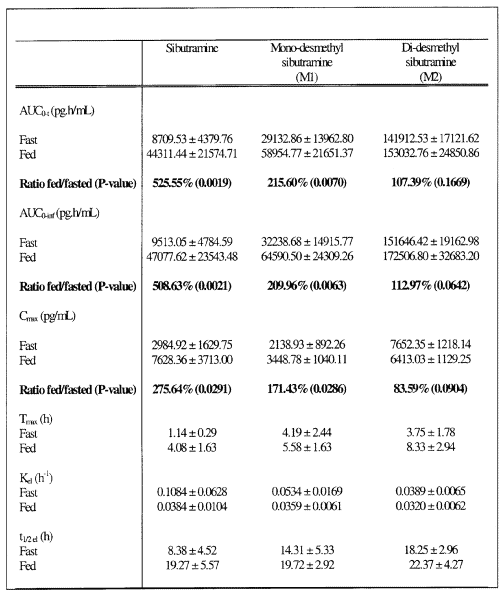 The food intake increased significantly AUCs and Cmax of sibutramine and its M1 metabolite; a five and three fold increase in AUCs and Cmax, respectively was observed for sibutramine and approximately two-fold increase for both parameters for M1 metabolite when the drug was administered with food. However, neither AUCs nor Cmax differed significantly between fasted and fed study periods for M2 metabolite. When administered with food, the time to peak plasma concentration was delayed by approximately 2 to 4 hours for sibutramine, M1 and M2 metabolites as reported in the literature. There was also a significant increase in elimination half-life of sibutramine following food intake. The elimination half-life calculated for sibutramine, M1 and M2 metabolites was 8 h, 14 h and 18 h respectively under fasting conditions and was between 20 h to 22 h for all analytes under fed conditions.