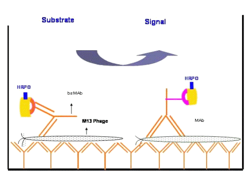 Figure 2: Diagrammatic representation of the homosandwich format of molecular zipper ELISA assays. The solid phase is coated with bivalent monospecific MAbs capturing the M13 virus with multiple epitope-paratope interactions. On the distal side of the plate surface, monospecific or bispecific antibodies and various substrates are used in the various types of homosandwich assays.