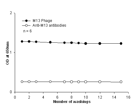 Figure 3: Resistance to leaching of M13 phages and anti-M13 antibodies. The M13 was biotinylated and was added to the plate coated with anti-M13 antibody to observe virus leaching from the solid phase upon multiple washings. The firmly bound M13 was detected using streptavidin-HRPO. Similarly, biotinylated anti-M13 antibodies were added to the plate coated with 107 phages/well to observe the dissociation of the bivalent antibody. Washings were carried out up to 15 cycles and amount of leaching was measured by the difference in OD using TMB substrate. Each point was done in hextuplicates and plotted with error bars that are not visible since they are well below 5%.