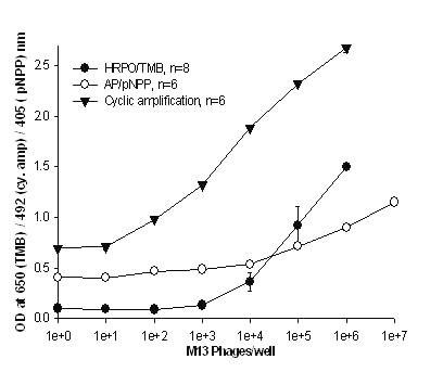 In our studies HRPO and AP were chosen as ELISA signal generating probes since they are the most common reporter enzymes in immunoassays. Practical detection limits by colorimetric methods using conventional TMB or pNPP for HRPO and AP respectively was in the range of 6,700 - 50,000 M13 particles (figure 4).