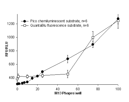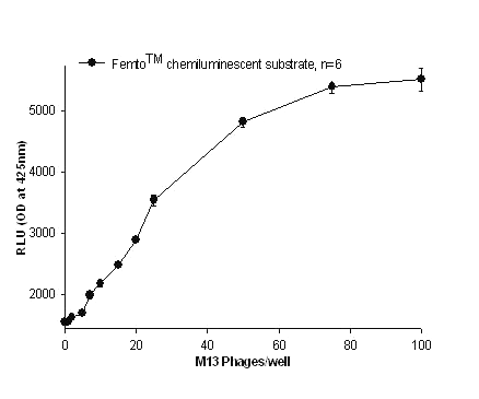 Dramatic improvements in the sensitivity of M13 detection were observed with fluorogenic (QuantaBluTM, Pierce Endogen Inc) and chemiluminescent substrates (PicoTM & FemtoTM ) with detection limits of 75, 15 and 7 phages /well respectively (Table 2 & Figure 5 & 6).