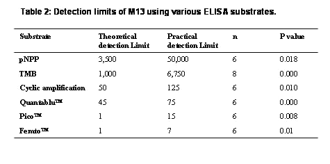 Table 2: TMB and pNPP are conventional substrates, QuantaBluTM, PicoTM and FemtoTM are the fluorogenic and chemiluminescent substrates respectively from Pierce Endogen Inc. *Theoretical detection limits are extrapolated values from mean + 2 SD of 20 blanks.