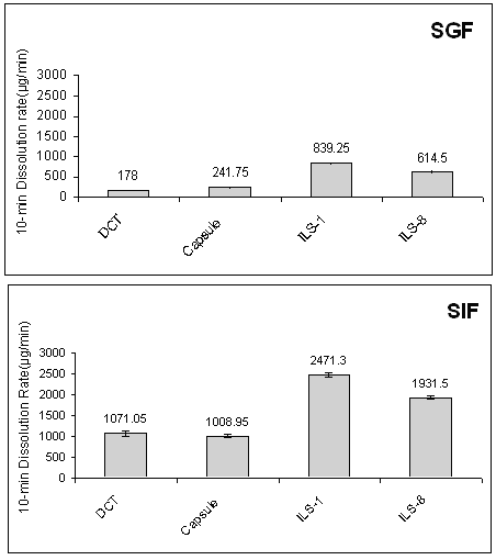 This Figure shows that liquisolid compacts produce higher dissolution rate in comparison with conventional dosage forms. Figure 2 shows the DR of indomethacin from ILS-1, ILS-8 (the highest and lowest concentrations of propylene glycol in formulations respectively), conventional capsule and directly compressed tablet in first 10 min.
