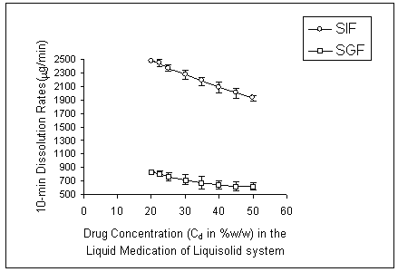As it is clear from this figure, at any dissolution media the liquisolid tablets displayed better in-vitro release characteristics than those of the directly compressed and capsule counterparts (p < 0.05). Figure 3 shows the effect of drug concentration (Cd) in the liquid medication on the 10 min dissolution rate (DR) of indomethacin from the propylene glycol liquisolid compacts in SGF and SIF media.