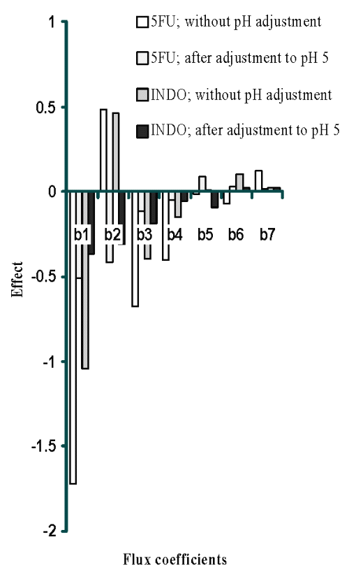 Plackett-Burman design (PBD) was employed to formulate chitosan films for screening the process and formulation variables that produced a significant (at 5% level of confidence) effect on flux (slope of linear portion of cumulative amount permeated vs time) of both drugs. The in vitro permeation of 5-FU and INDO across chitosan films was significantly influenced by concentration of chitosan, concentration of sodium citrate and cross-linking time when chitosan films were cross-linked by sodium citrate solutions either without pH adjustment (Table 1) or after adjustment to pH 5 (Table 2). This indicates that the influence of active process and formulation variables on in vitro permeation of both drugs remained unaltered even when chitosan films were cross-linked after pH adjustment of sodium citrate solutions. The flux of 5-FU across rat, rabbit and human epidermal sheets was found to be 2.05 ± 0.15, 2.47 ± 0.03 and 0.72 ± 0.03 mg/h/cm2, respectively. For INDO these values were 92.6 ± 2.5, 217.6 ± 7.5 and 34.2 ± 3.2 mg/h/cm2, respectively. The in vitro permeation of both drugs across chitosan films cross-linked by sodium citrate without pH adjustment (Tables 1 and 2) was significantly more than that across both rat and human epidermal sheets. Therefore, additional films were prepared by cross-linking chitosan films with sodium citrate solutions after adjusting them to pH 5. The coefficients (b1...b7) associated with the effect of various formulation and process variables on flux of both drugs across chitosan films are shown in Figure 1.