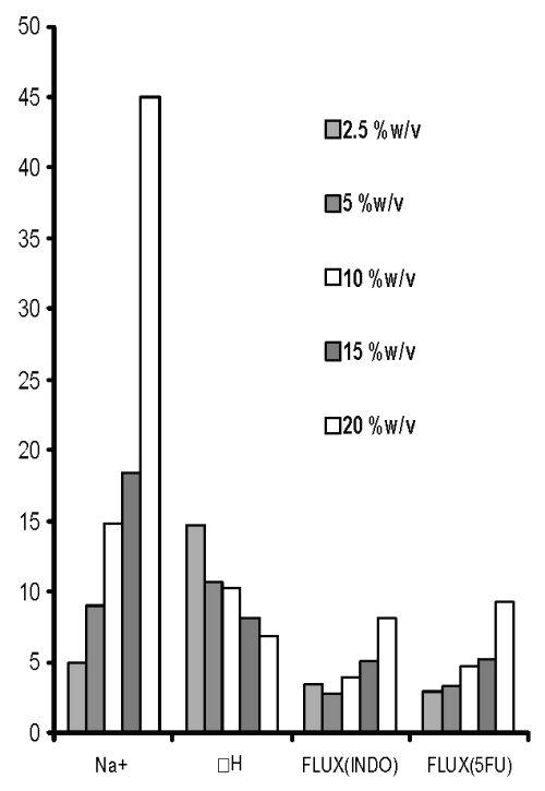 Figure 3: Sodium content (Na+, mg/film), third endothermic DH (J/g) and permeation of 5-FU (mg/h/cm2 X 10-2 ) and INDO (mg/h/cm 2 X 10-1 ) across chitosan films prepared with different concentrations of sodium citrate solutions without pH adjustment.