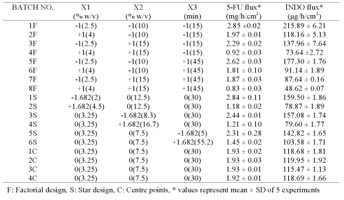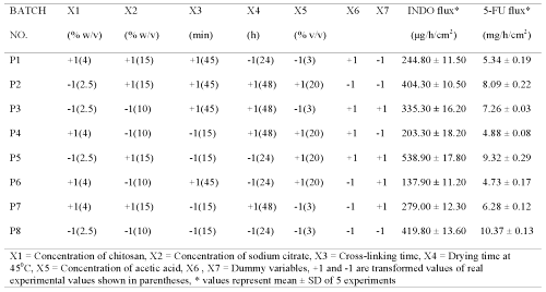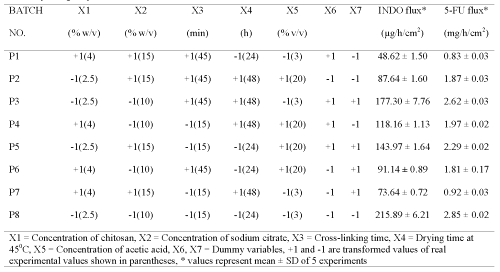 Table 1: Screening design for identifying active formulation and process variables influencing flux of indomethacin (INDO) and 5-fluorouracil (5-FU) across chitosan films cross-linked with sodium citrate without adjustment to pH 5.