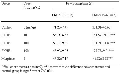In formalin test, the animals which received SKHE more than 200 mg/kg showed sleepy or some kind of immobility phenomena which interfere with the test.