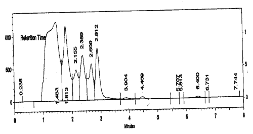 HPLC of RP-1 was performed with Simadzu HPLC system using C-18 column and UV detector. Methanol:water :: 70:30; v/v, were used as eluents and the flow rate was maintained at 1 ml/min. The HPLC fingerprint revealed nine prominent peaks (Fig. 1).