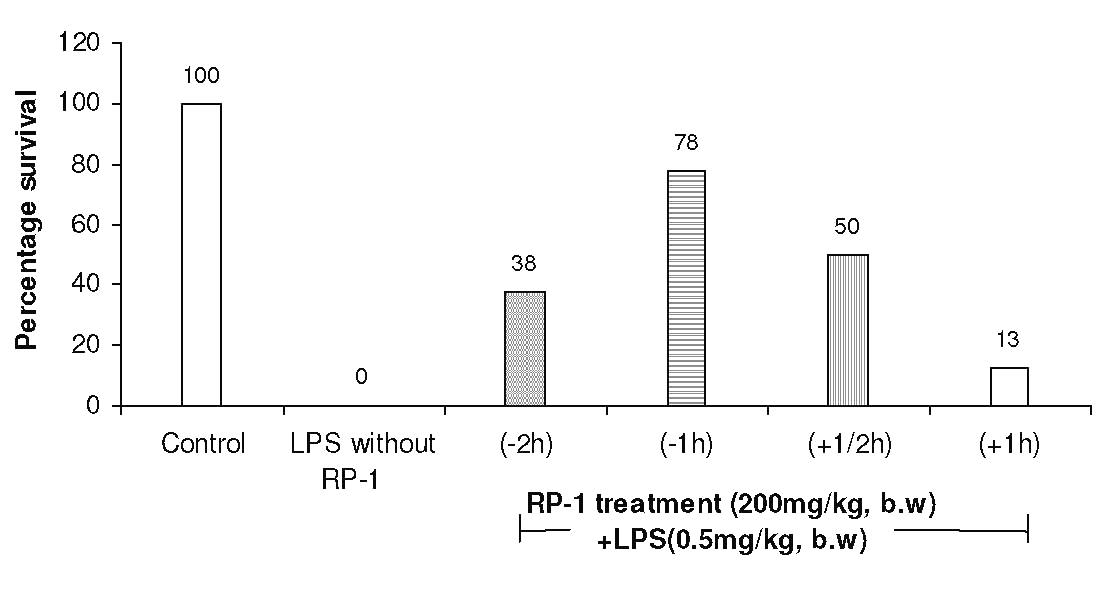 The other doses of RP-1 were, however, less effective (Fig. 3). RP-1 treatment (200 mg/kg b.w., i.p.) administered one hour before LPS challenge rendered maximum survival (Fig. 4).