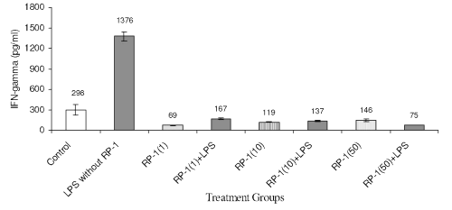 Figure 5: Effect of different doses of RP-1 (mg/ml; mentioned in parenthesis) administered one hour before LPS (5 mg/ml) treatment to peritoneal macrophages (ex vivo culture from female Balb/c mice). The supernatant was investigated for IFN-g secretion 48 h after treatment. Each bar represented mean+S.D of three repeats.