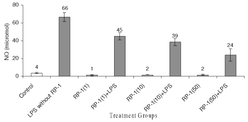 RP-1 treatment to peritoneal macrophage alone reduced nitrite level significantly ( p< 0.05 ) as compared to untreated control group, yet the inhibition of nitrite among groups treated with different doses of RP-1 remained insignificant. However, increasing doses of RP-1 administered one hour before LPS challenge reduced nitrite levels significantly ( p< 0.05 ) in a dose dependent manner.