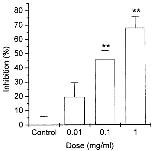 Figure 1: Effect of GBIT extract on compound 48/80-induced histamine release from RPMCs. RPMCs (2x10 5 cells) were preincubated with various concentrations of GBIT extract at 37°C for 10 min prior to incubation with compound 48/80. Each datum represents the mean+S.E.M. of three independent experiments. **P<0.01; significantly different from the control value.